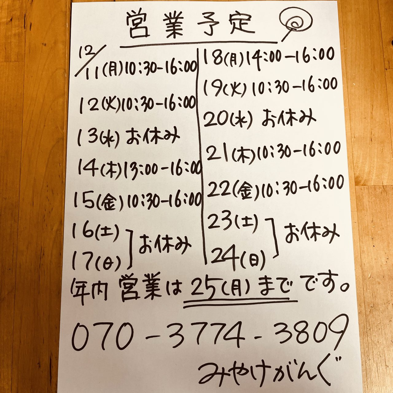 営業日のお知らせ12月11日〜12月24日 2023.12.10 営業日のお知らせ 営業日のお知らせ 街はクリスマスムードでいっぱい⛄️ 年内みやけがんぐは12/25までの営業となります。 クリスマス対応の菓子袋の受付は終了とさせていただきます。