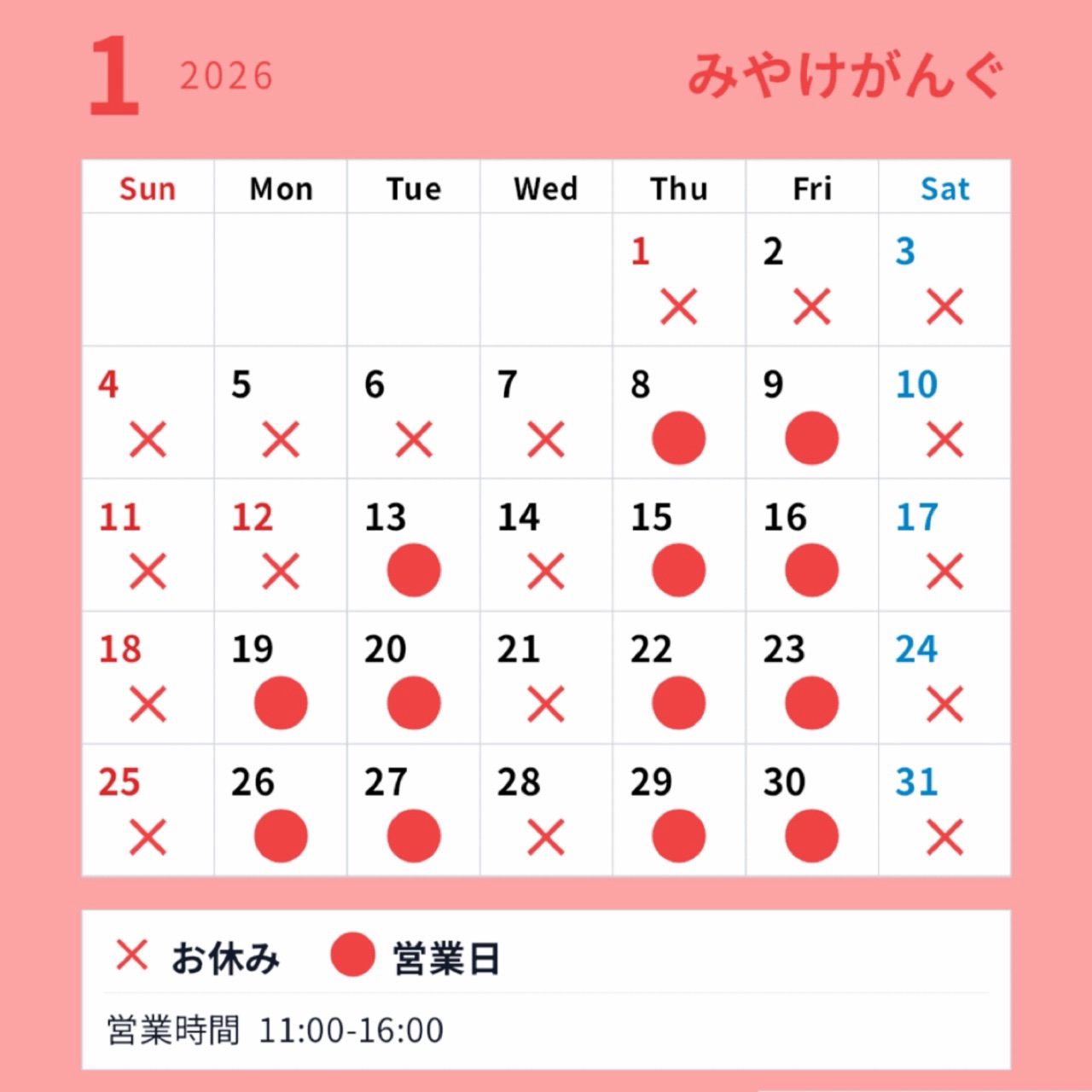 営業日のお知らせ2026/1 2025.12.25 営業日のお知らせ 営業日のお知らせ いつもありがとうございます🍭 年内の営業は25日で終了。 年始は8日からの予定です。 今年も大変お世話になりました。 みなさま 穏やかな年末年始をお過ごしくださいませ🧸